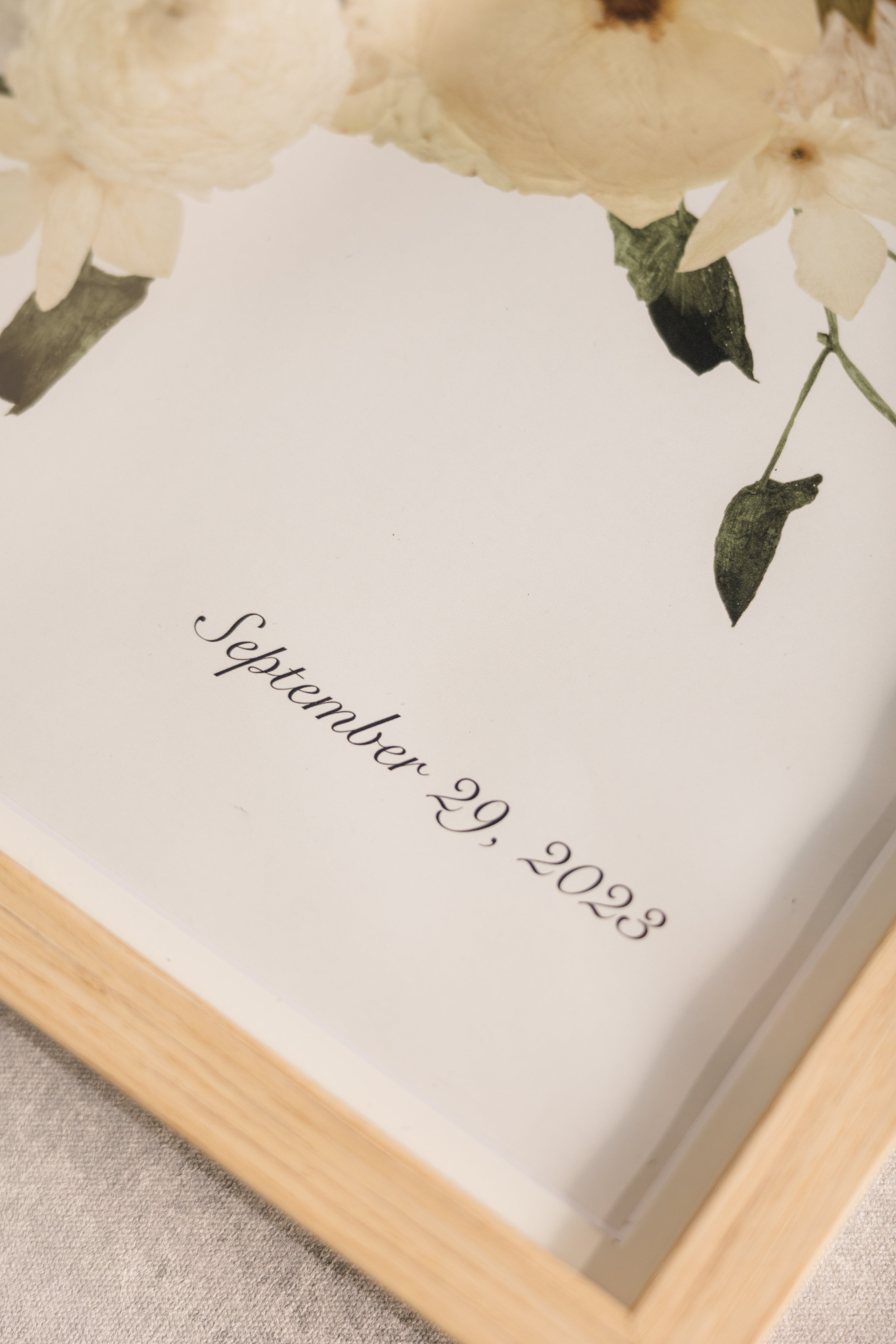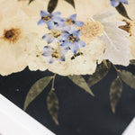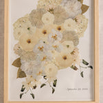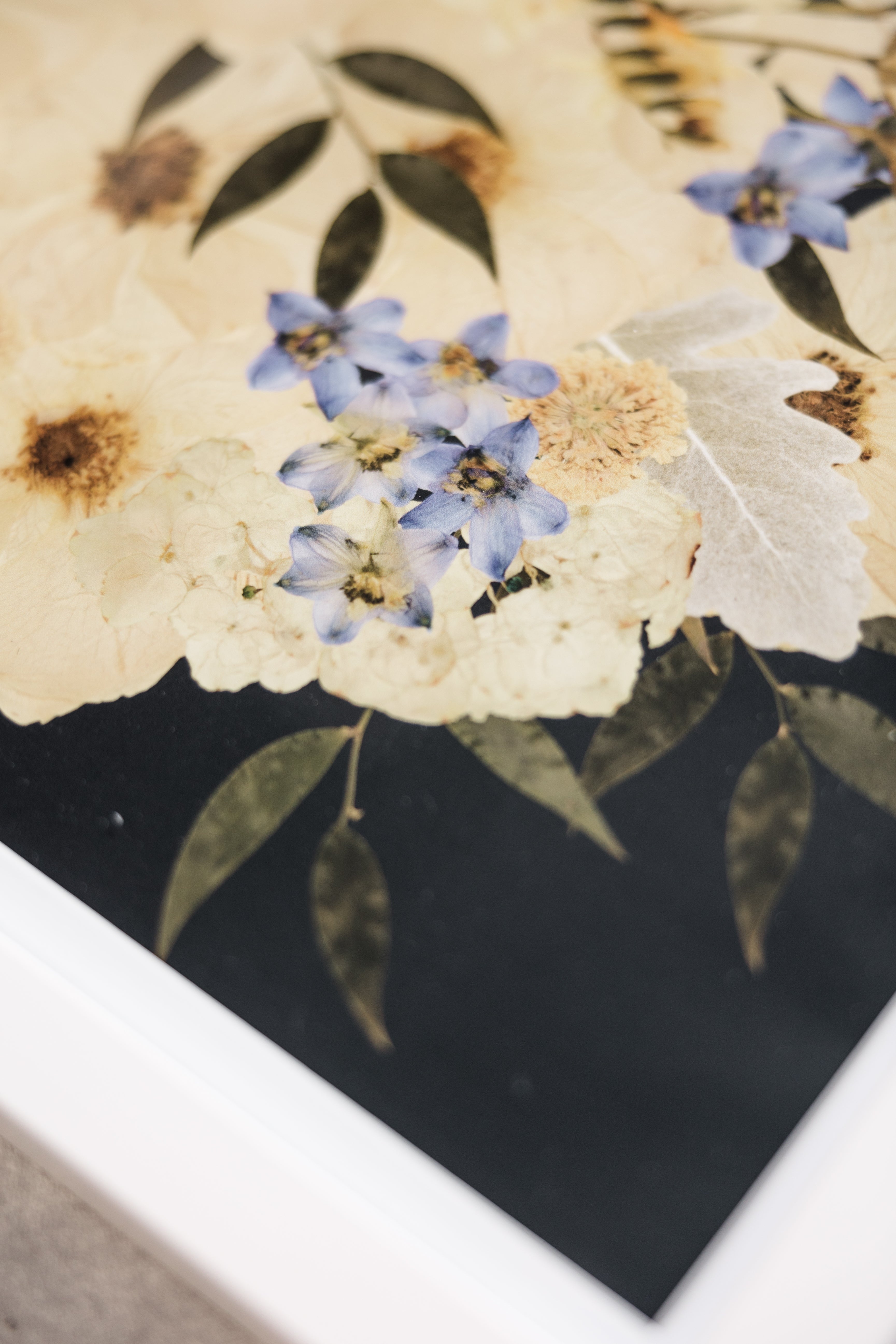 Using photographs of pressed flowers from our digital library, we bring your original arrangement back to life through a digitally designed pressed work of art!