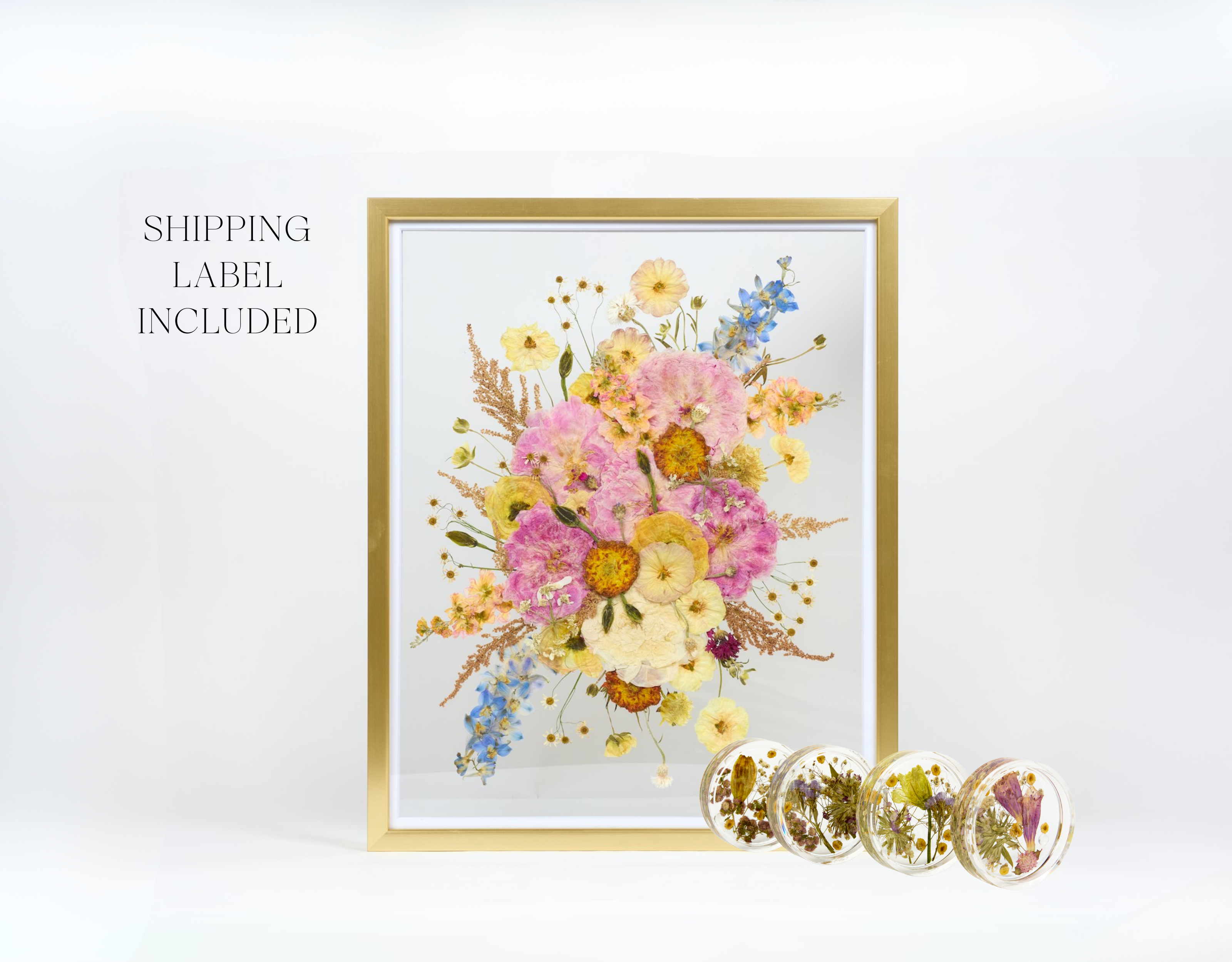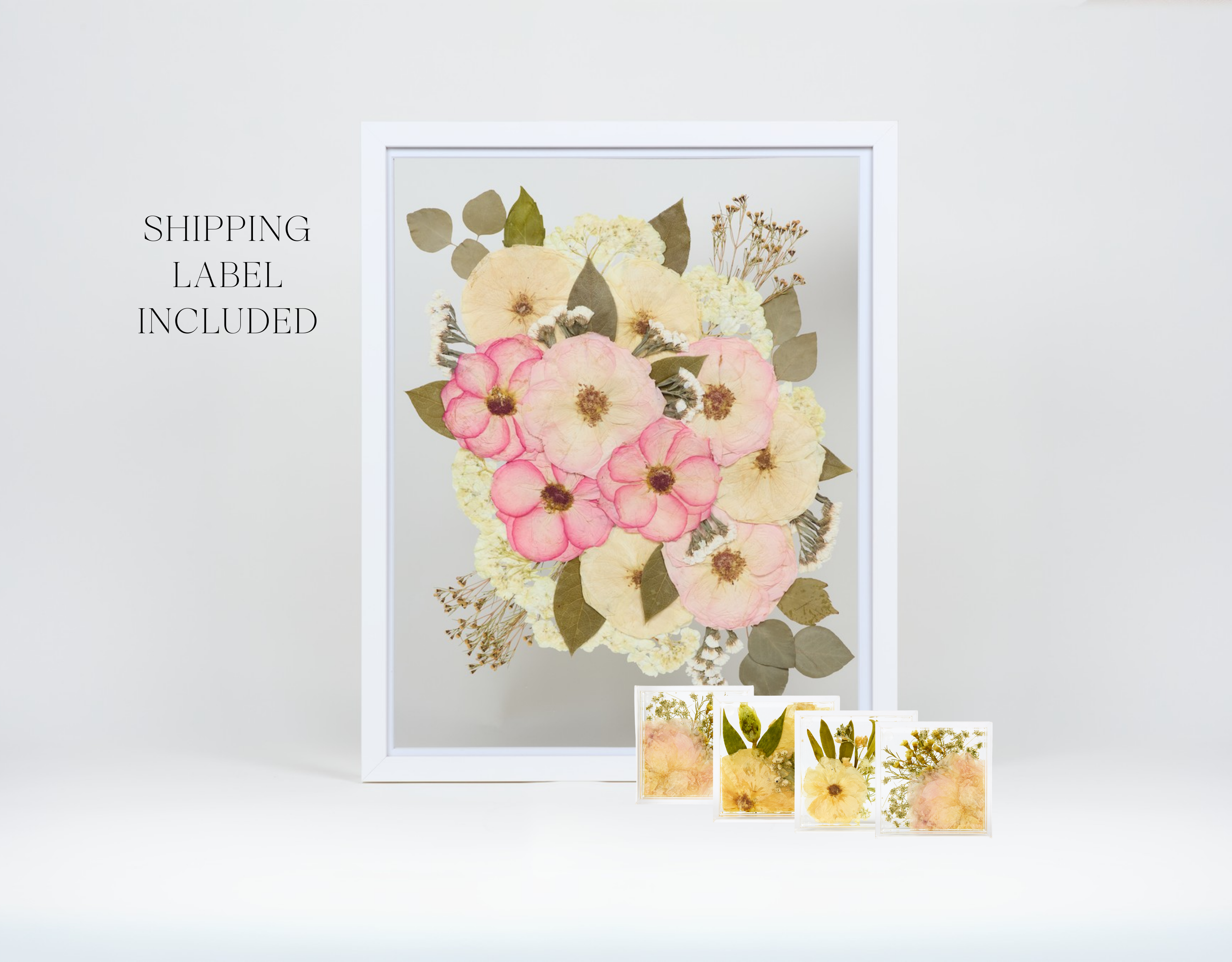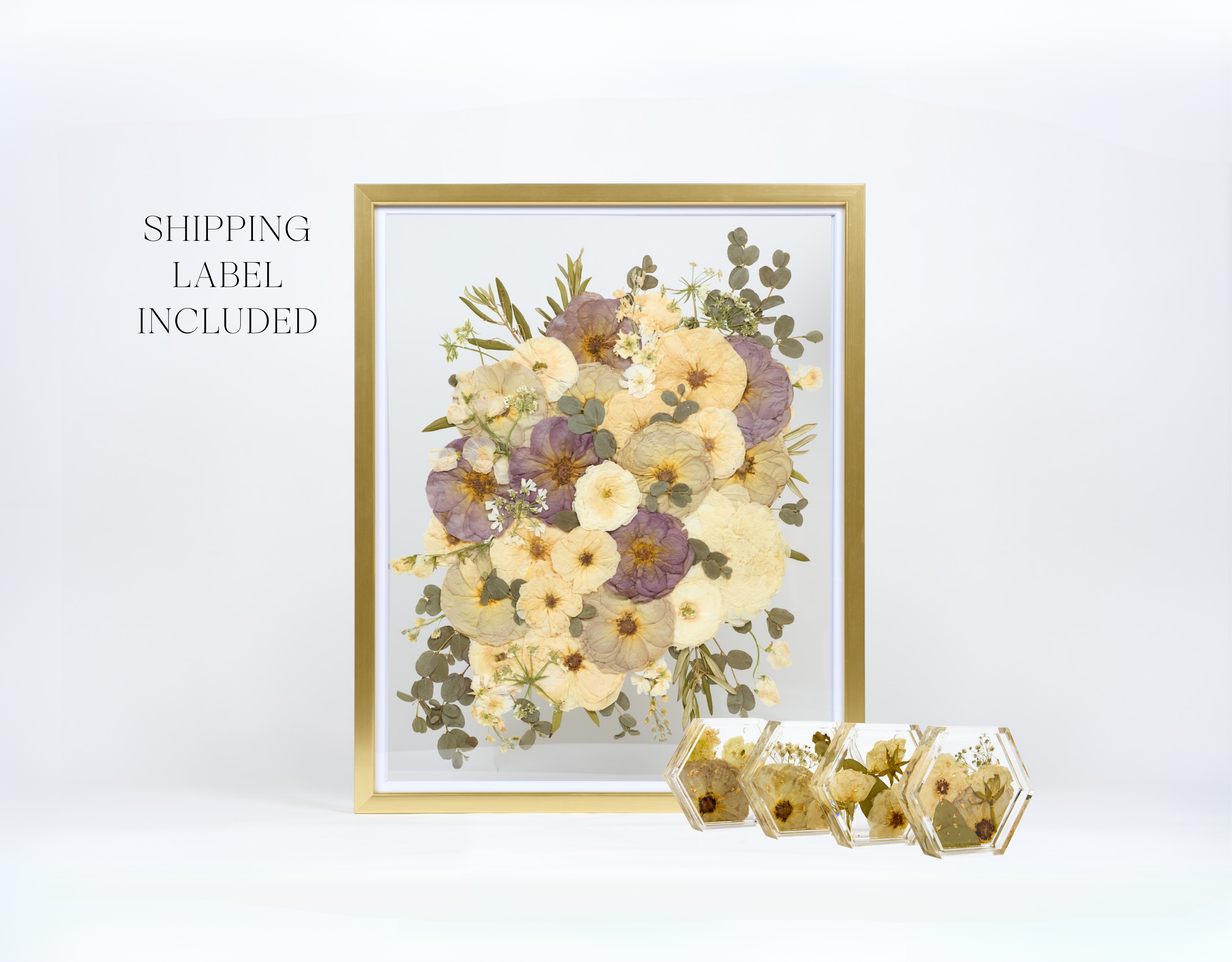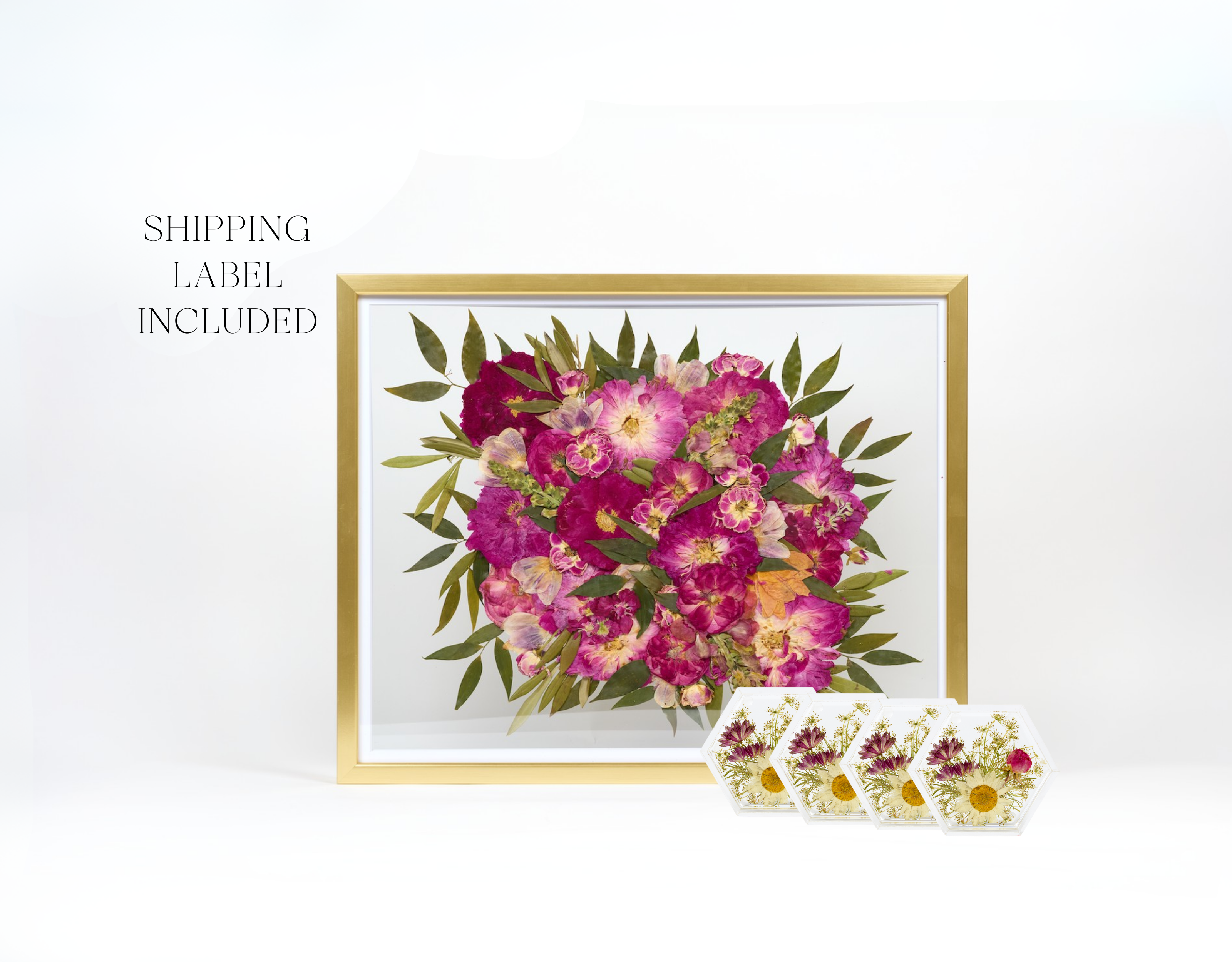 Capture the beauty of your special day with Keepsake + Ship, the perfect all-in-one preservation package. This exclusive bundle includes a 16x20 frame, a set of 4 resin coasters, and a pre-paid fresh flower shipping label.