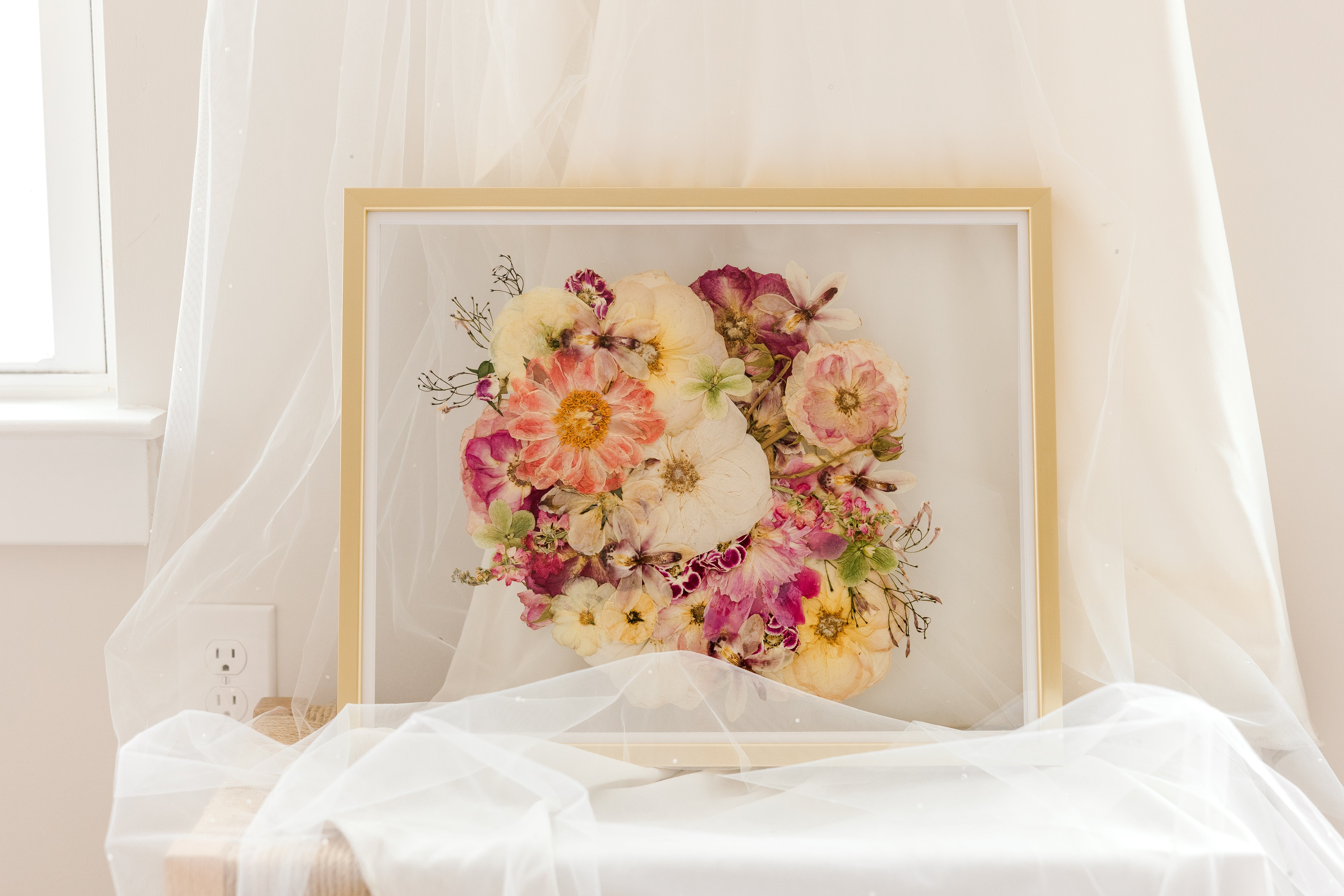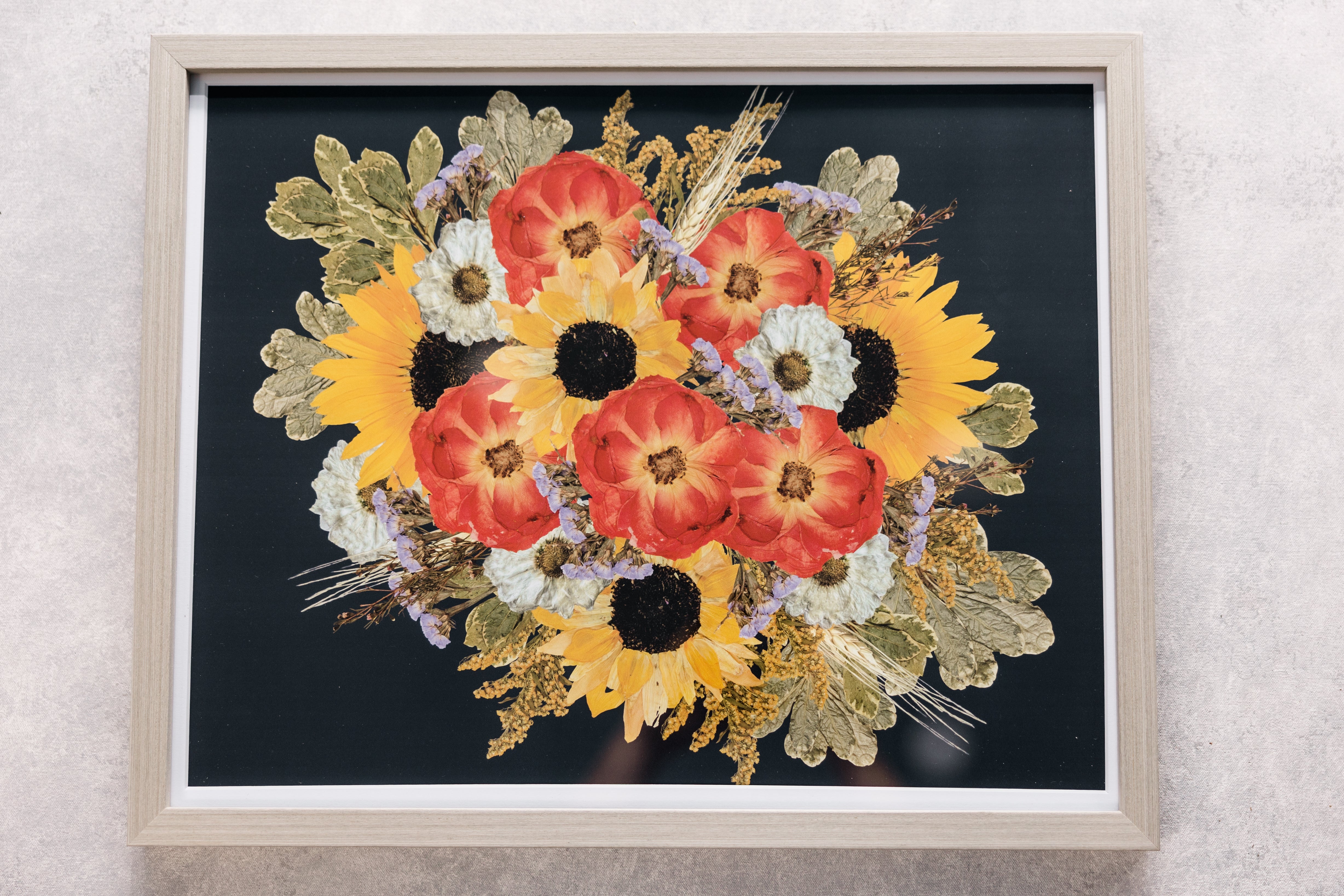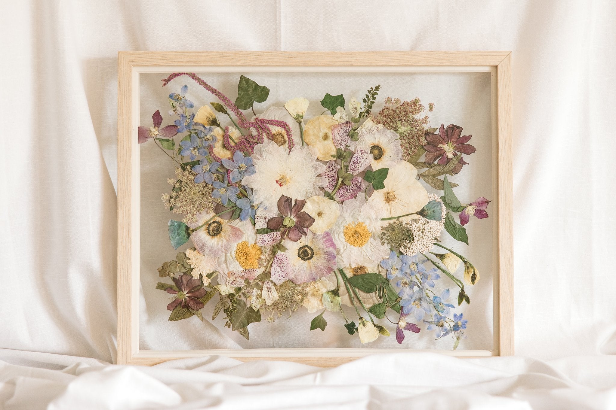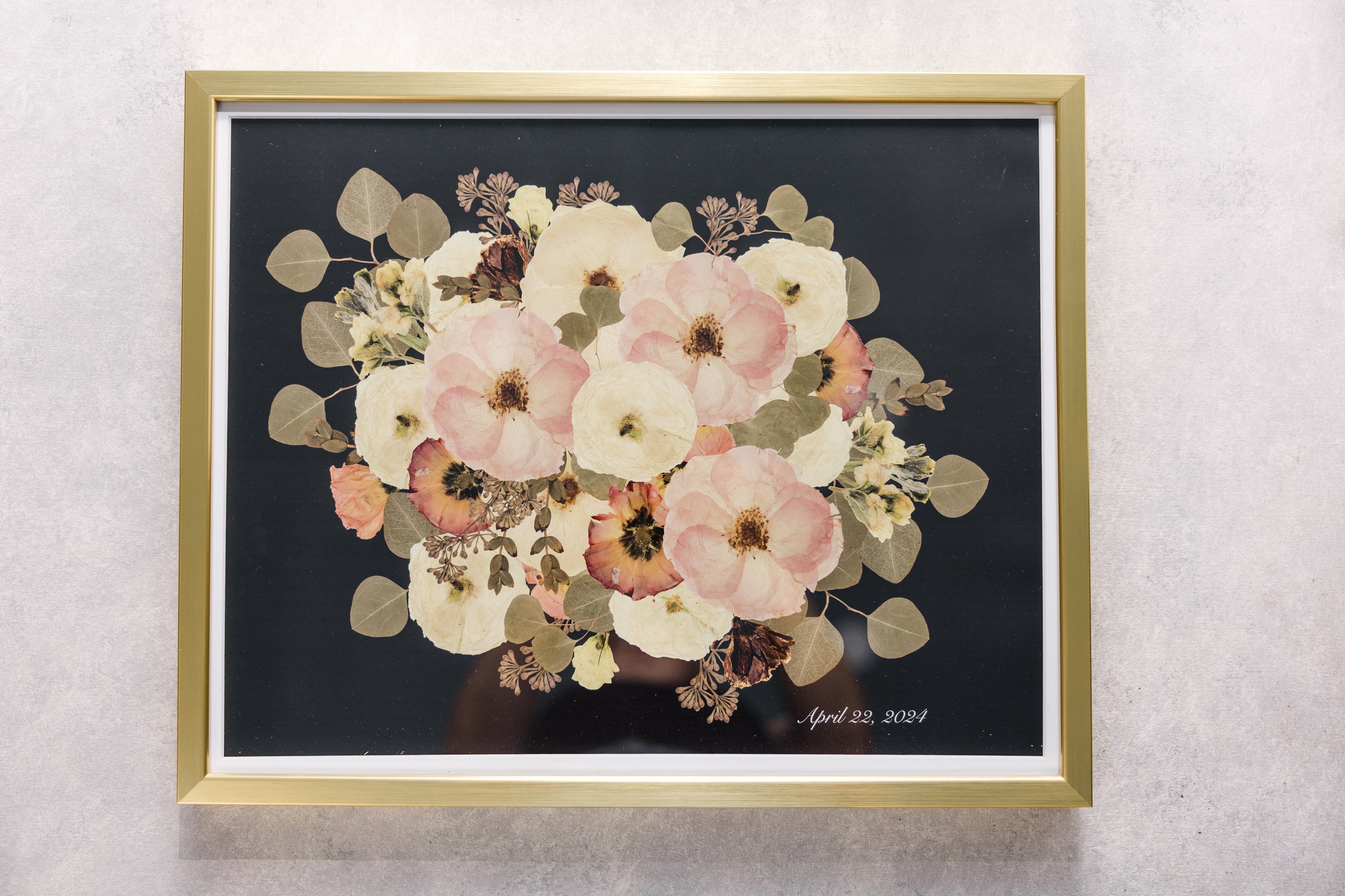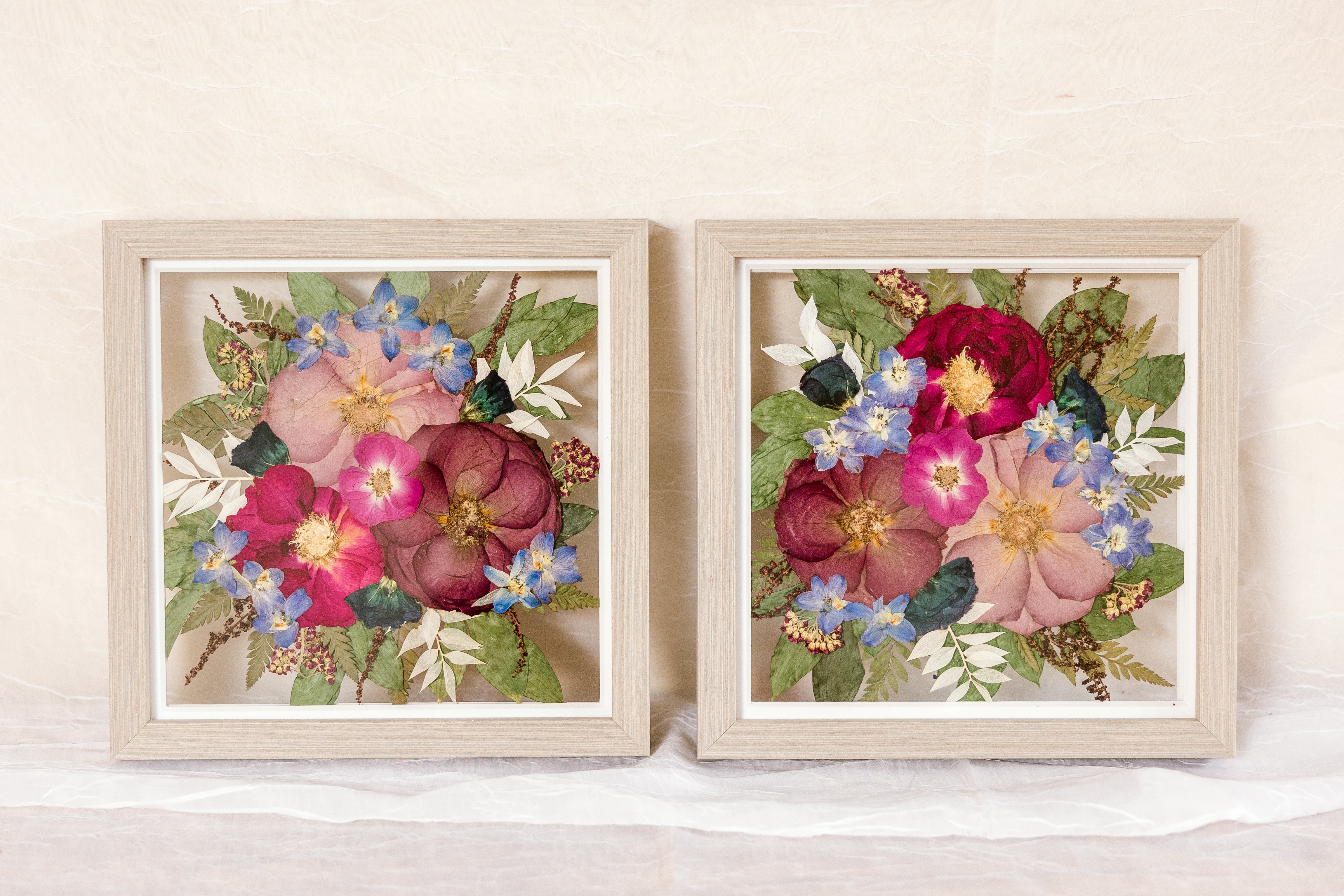 It's important to keep in mind that fresh flowers will change once pressed. They transition from a vibrant, three-dimensional bloom to a flat, one-dimensional form, which is then used to recreate your fresh arrangement into either framed artwork or a functional resin piece.