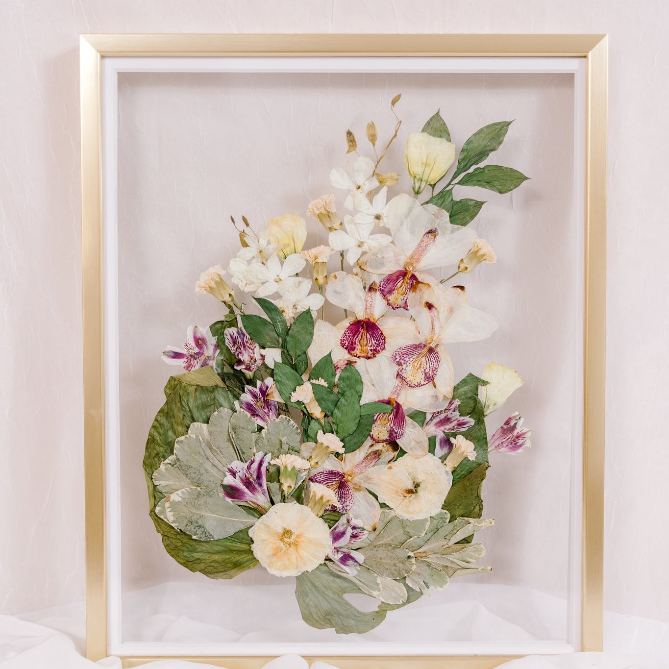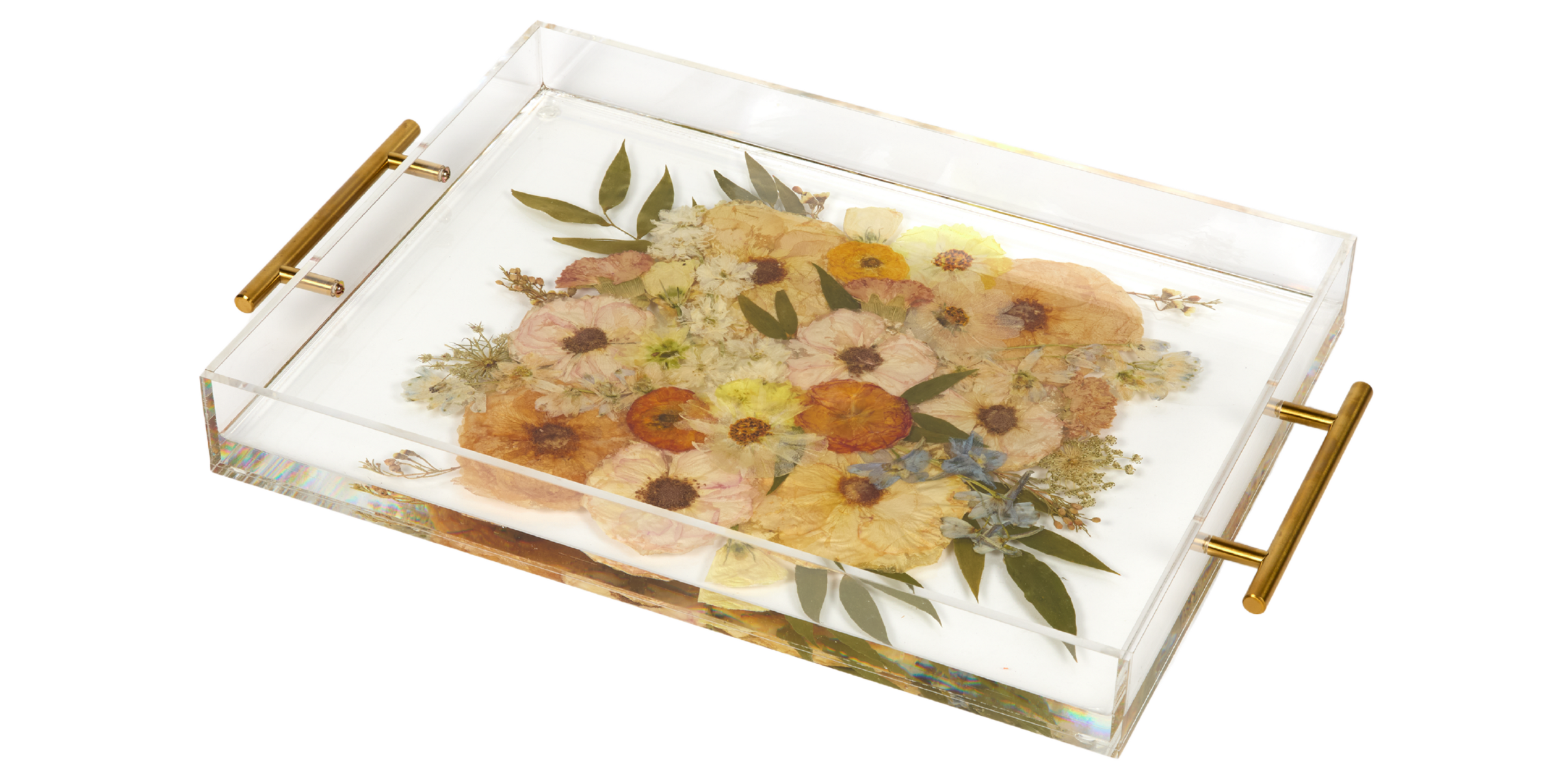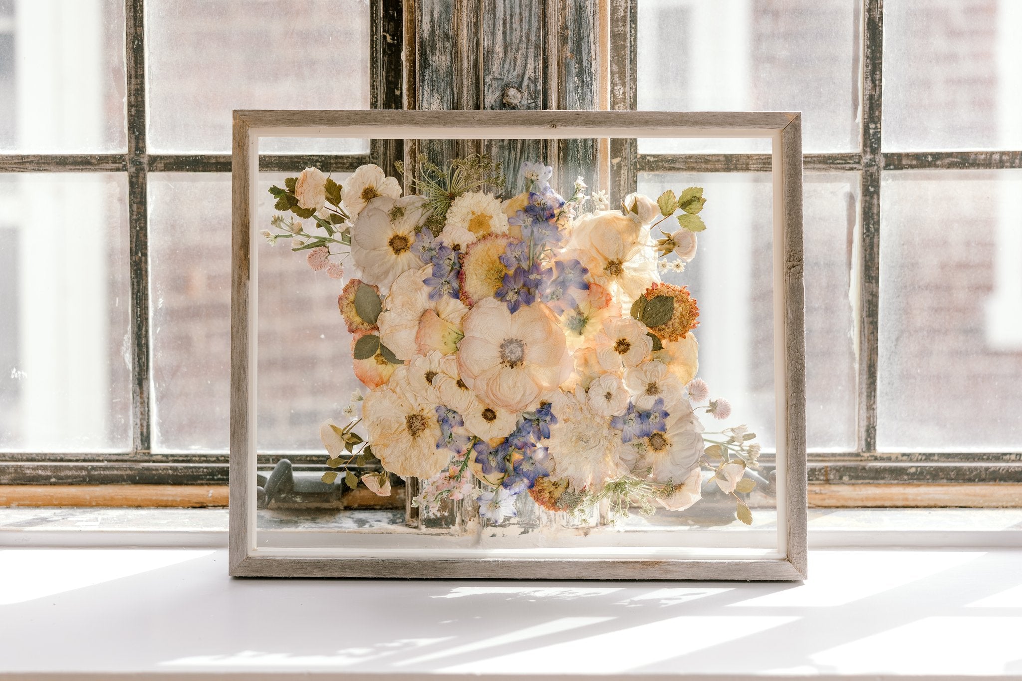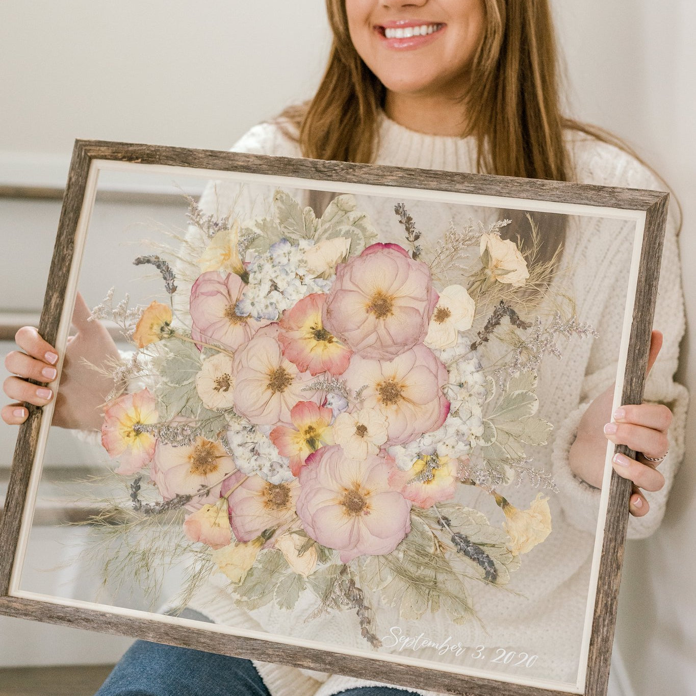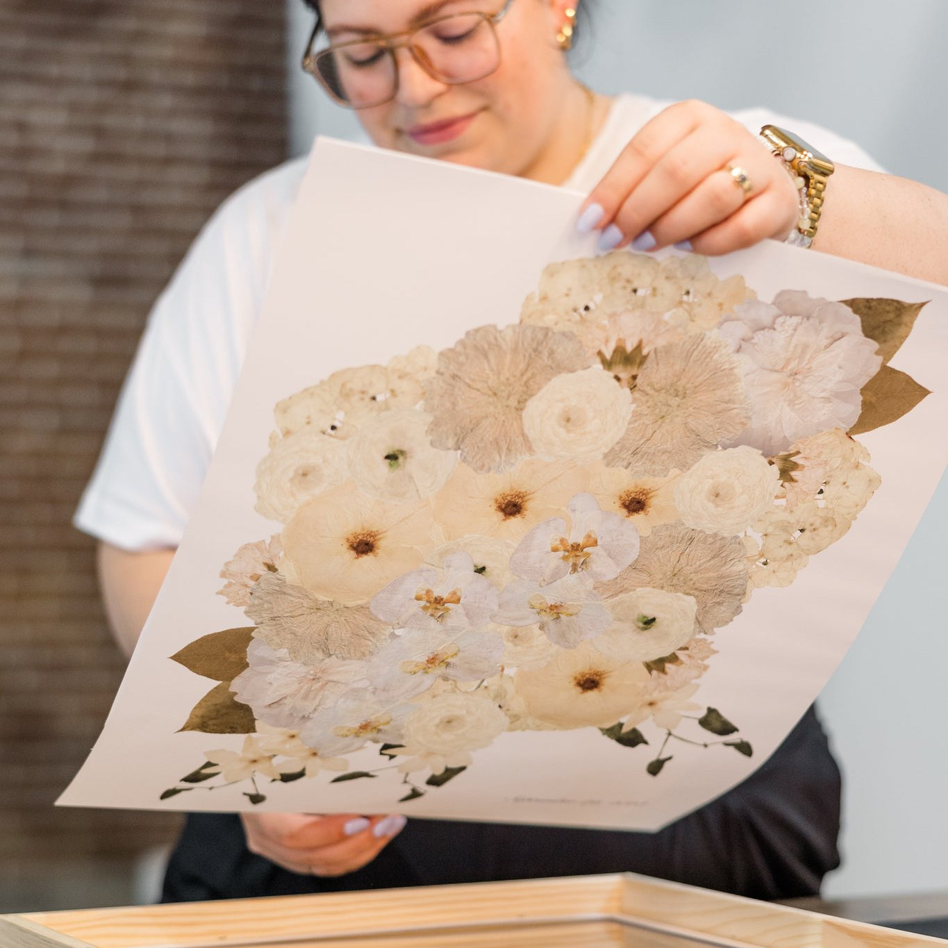 It's important to keep in mind that fresh flowers will change once pressed. They transition from a vibrant, three-dimensional bloom to a flat, one-dimensional form, which is then used to recreate your fresh arrangement into either framed artwork or a functional resin piece.