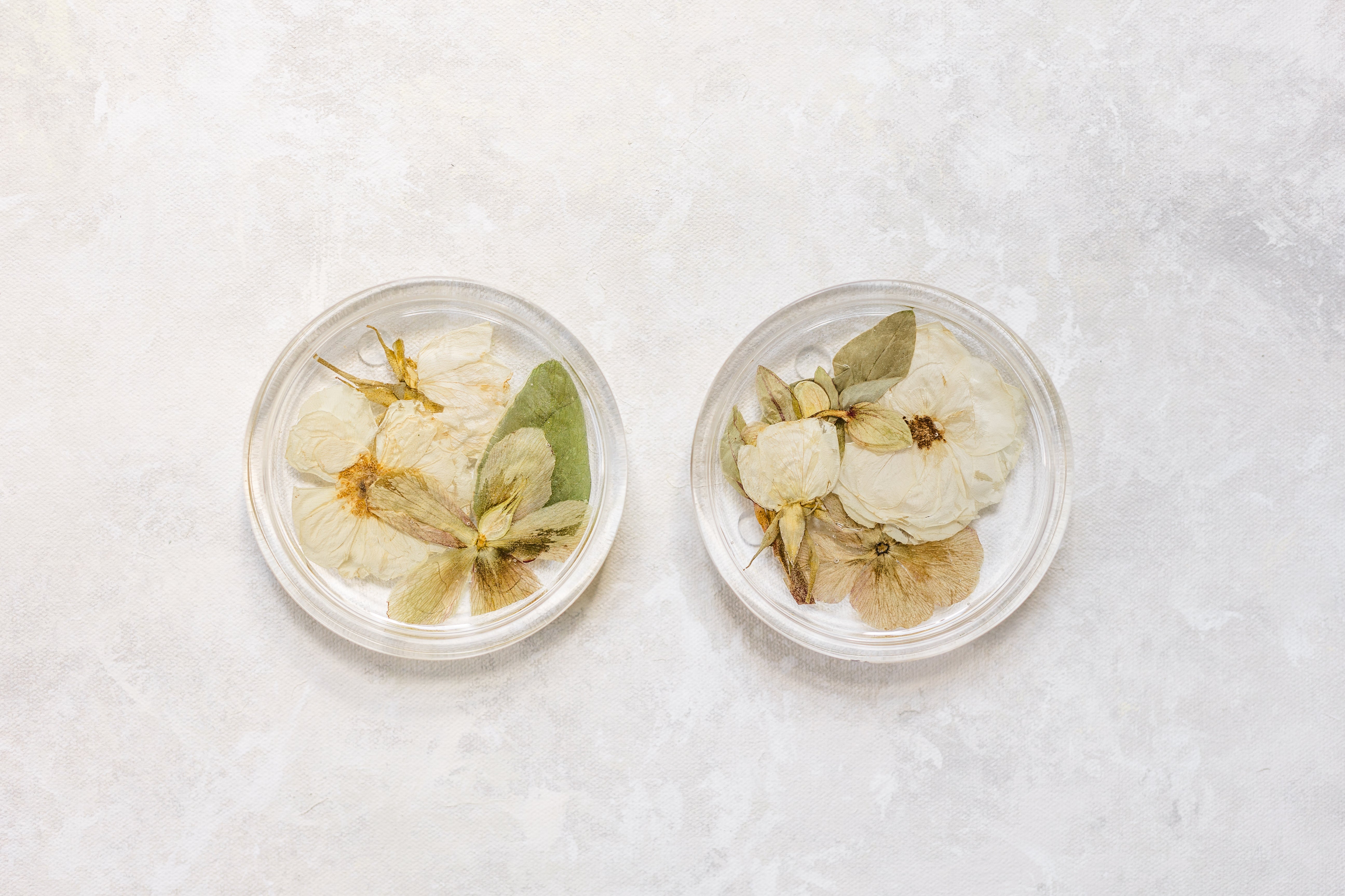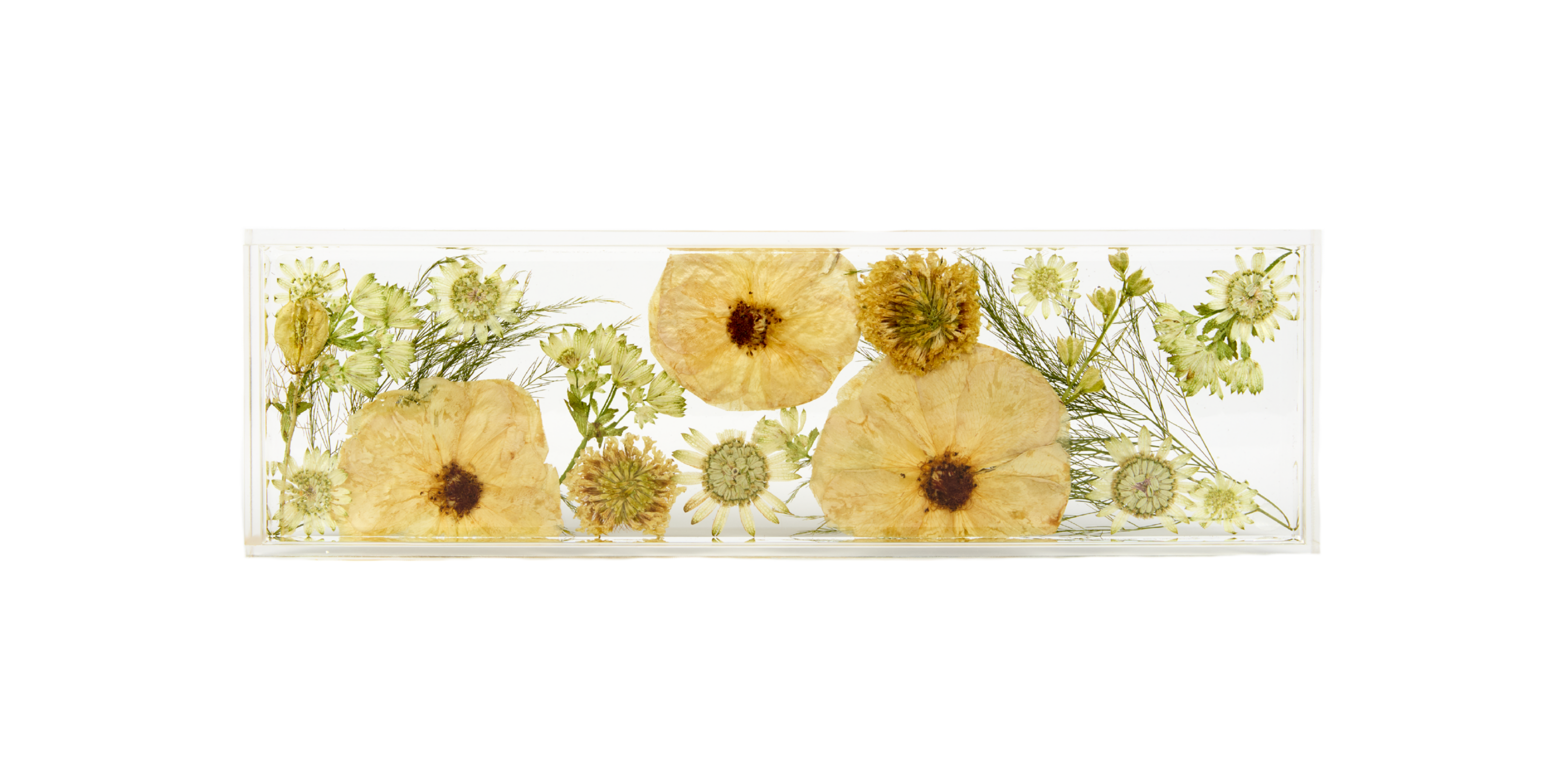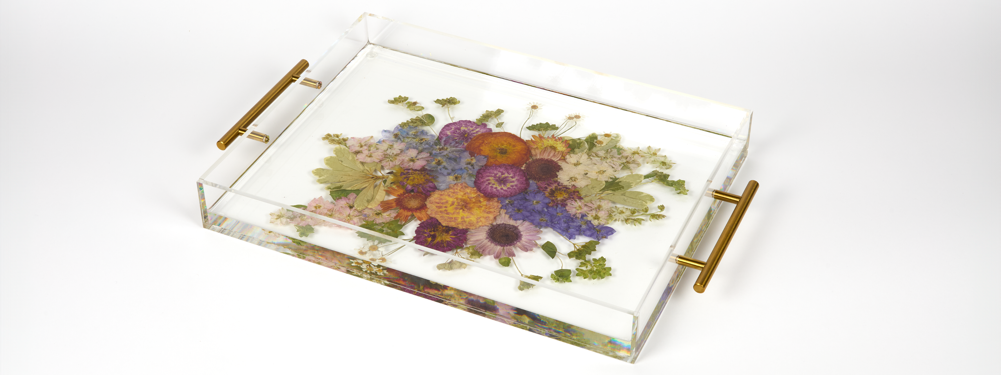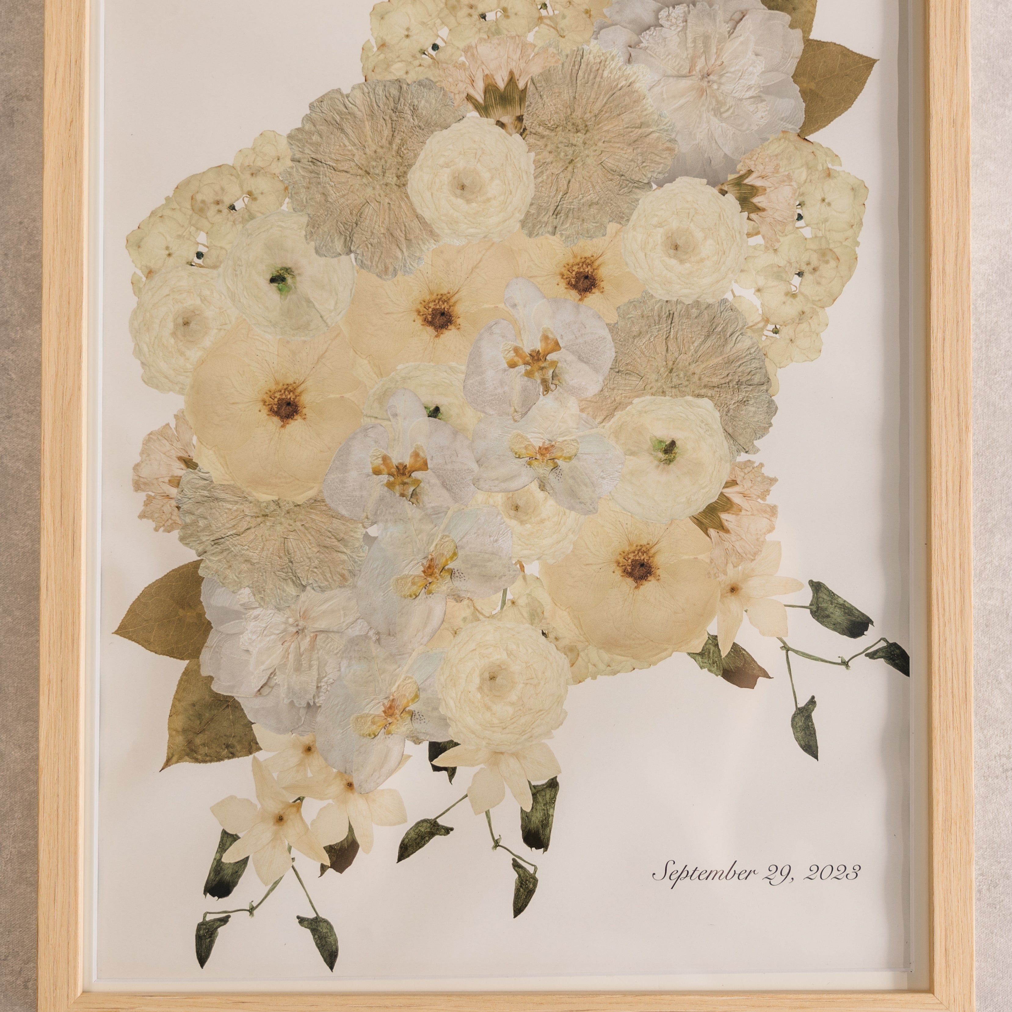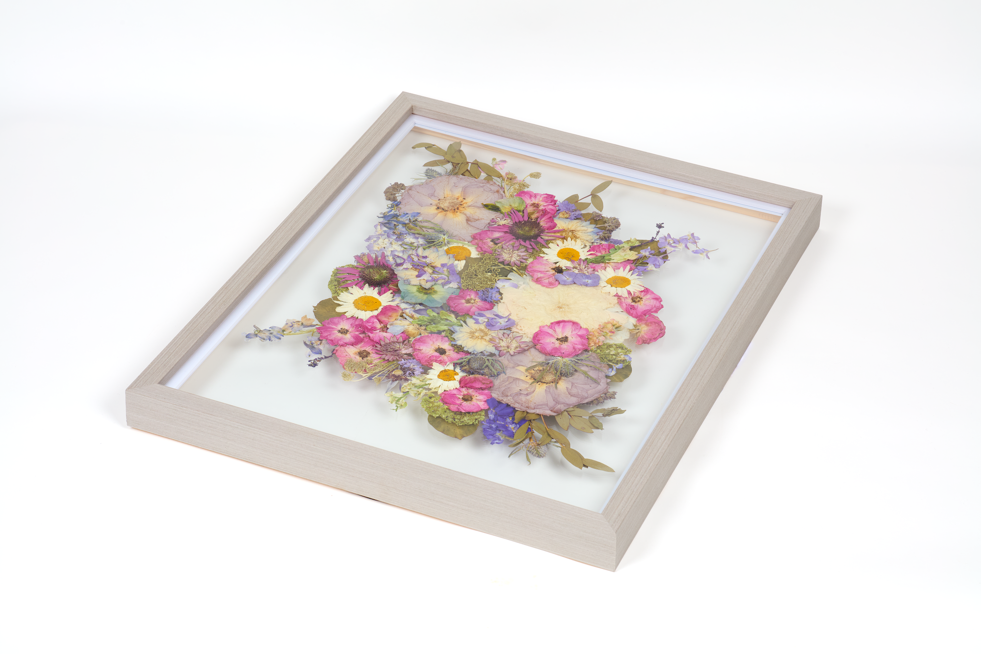 It's important to keep in mind that fresh flowers will change once pressed. They transition from a vibrant, three-dimensional bloom to a flat, one-dimensional form, which is then used to recreate your fresh arrangement into either framed artwork or a functional resin piece.