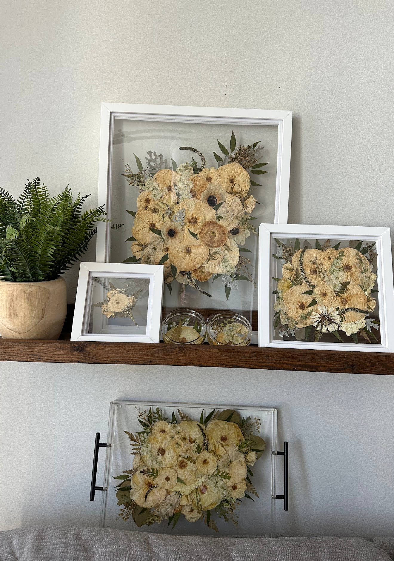 "My husband surprised me with a remake of my bouquet for our 5th wedding anniversary and I got them pressed by Pressed Bouquet Shop and they are by far one of the most favorite pieces in my living room! I got the full bundle with a frame and tray and coasters. I love that I get to keep this little part of our story forever and use them every day! 10/10 would recommend the team at Pressed!!"