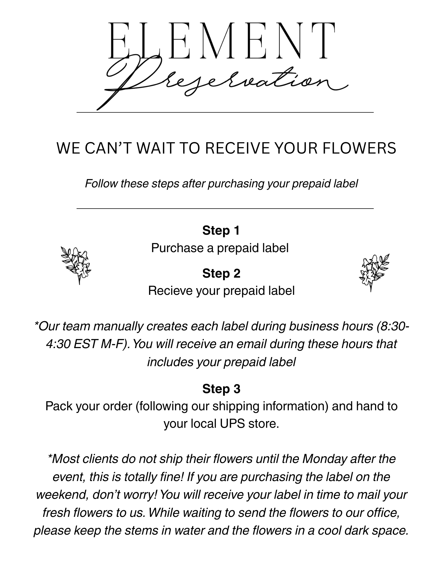 • Easy Tracking: Each label includes a tracking number so you can monitor your flowers’ journey to our studio.
