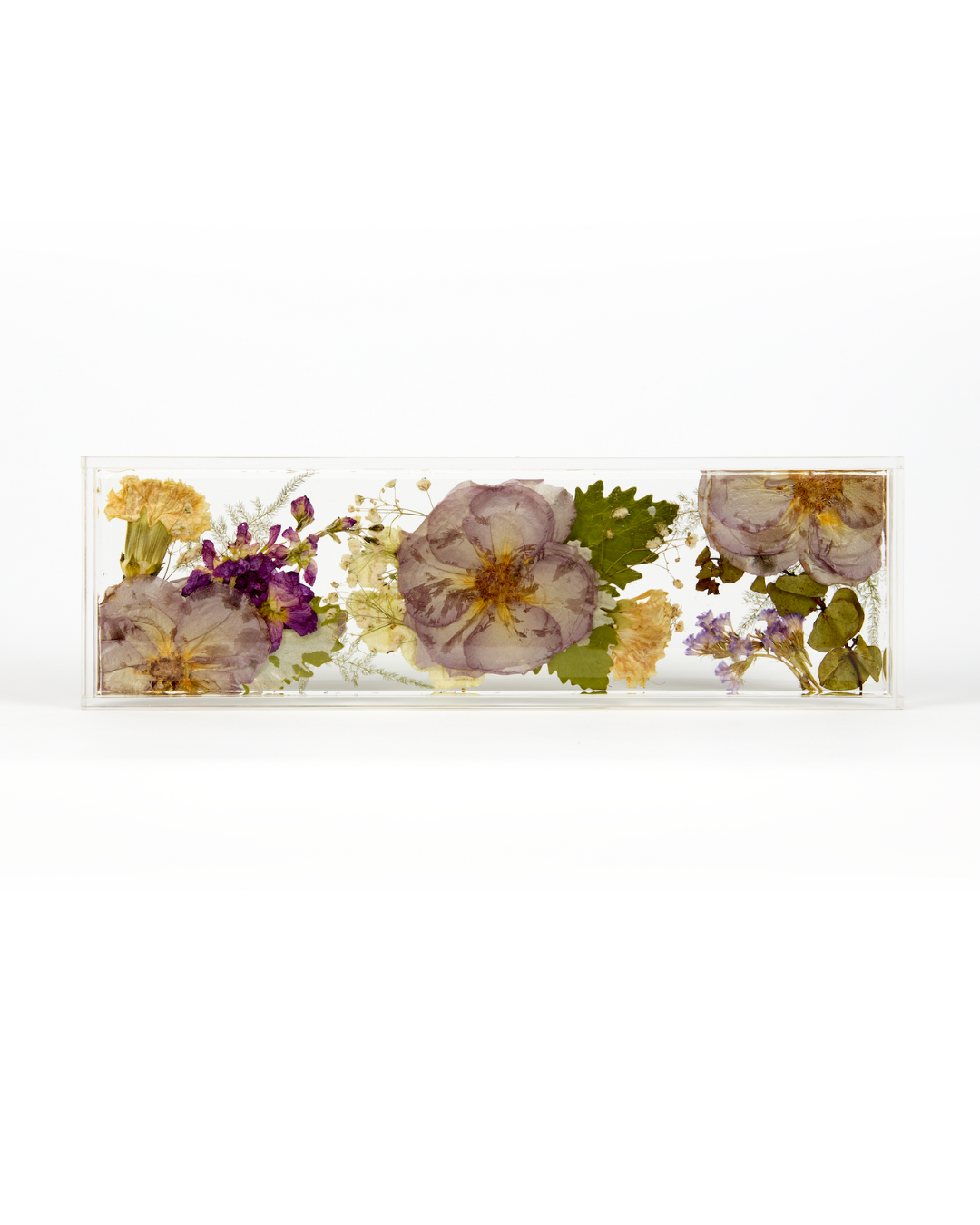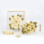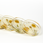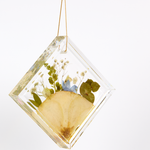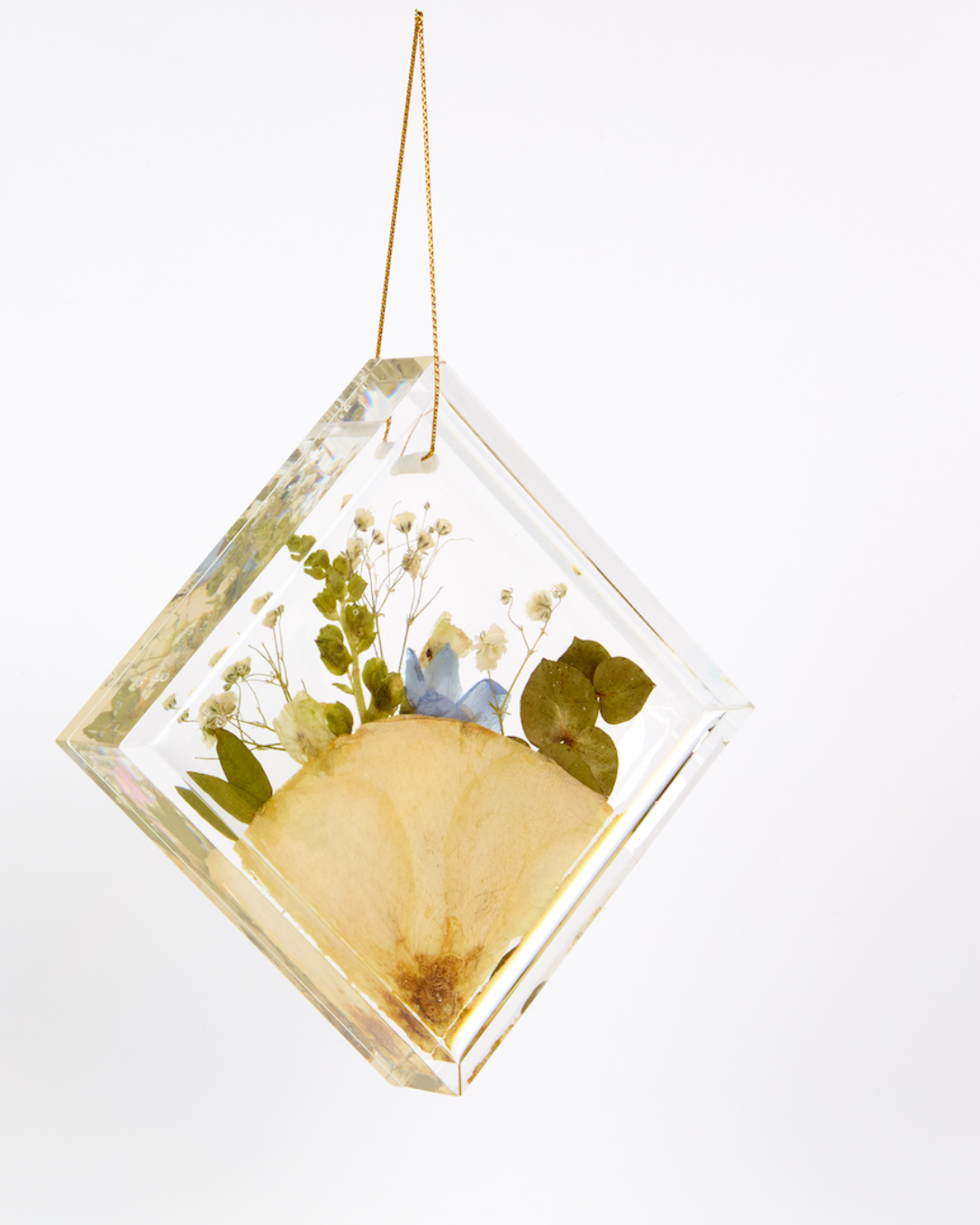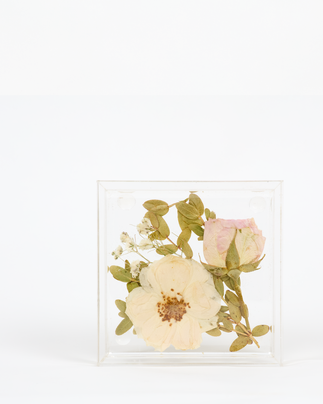 All flowers change slightly when preserved in resin due to the chemical reaction with the natural petals. Most often we notice white flowers having a more yellow hue, and single-layer flowers with transparency. Other changes may occur due to the nature of the process.