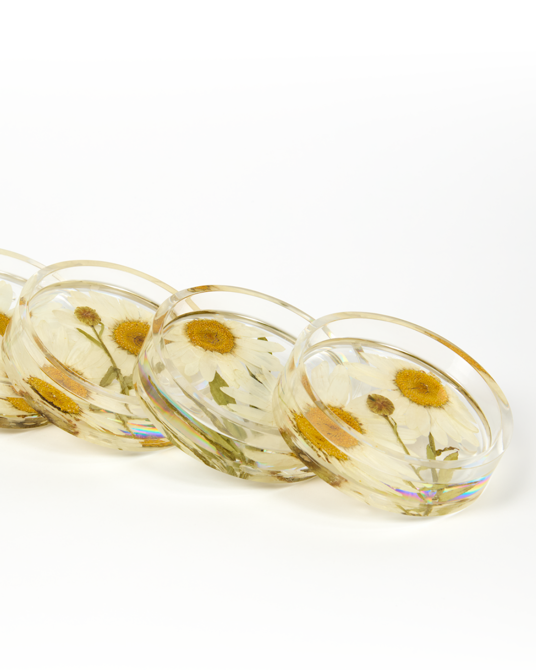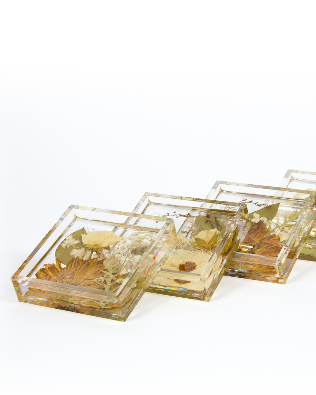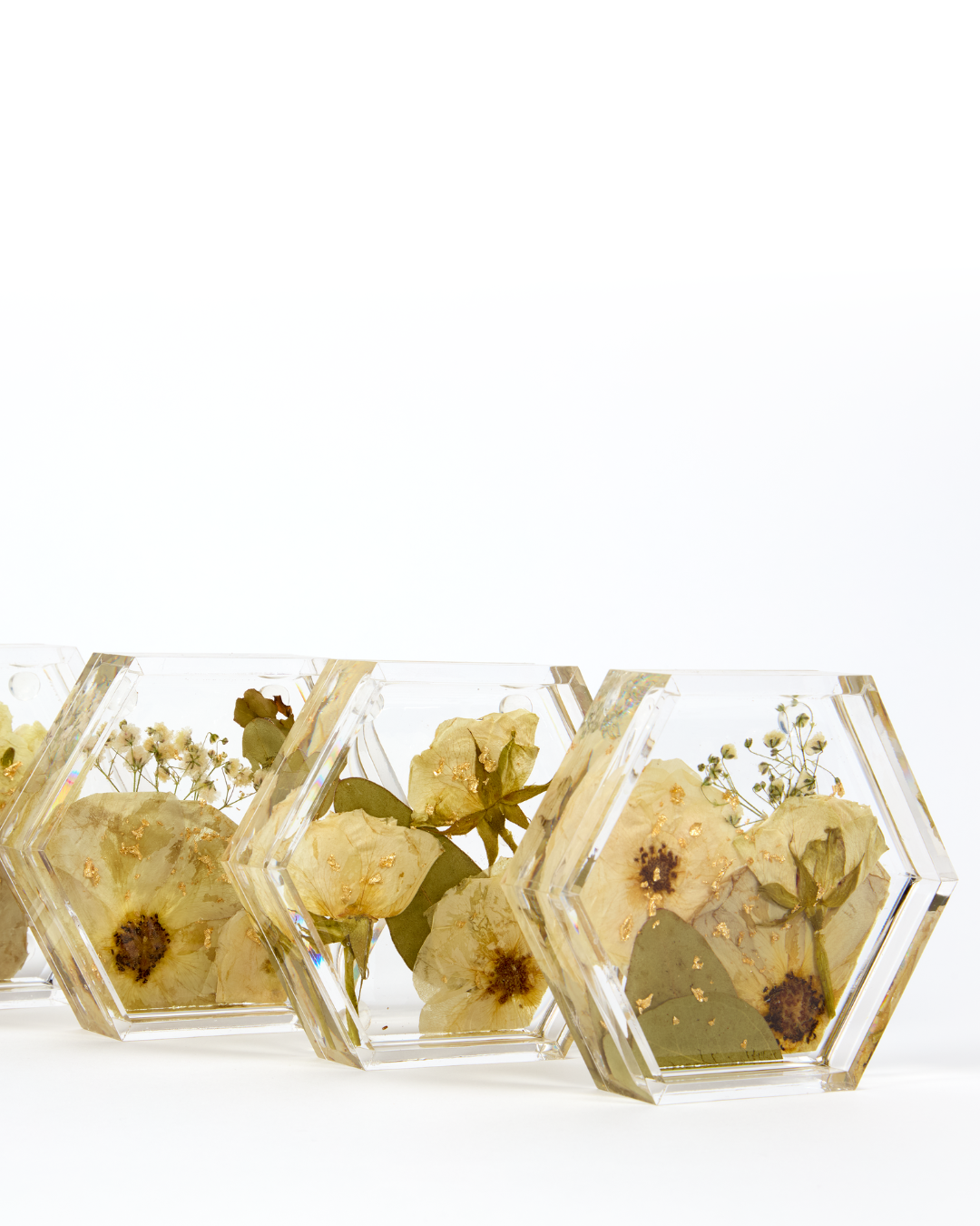 All flowers change slightly when preserved in resin due to the chemical reaction with the natural petals. Most often we notice white flowers having a more yellow hue, and single-layer flowers with transparency. Other changes may occur due to the nature of the process.
