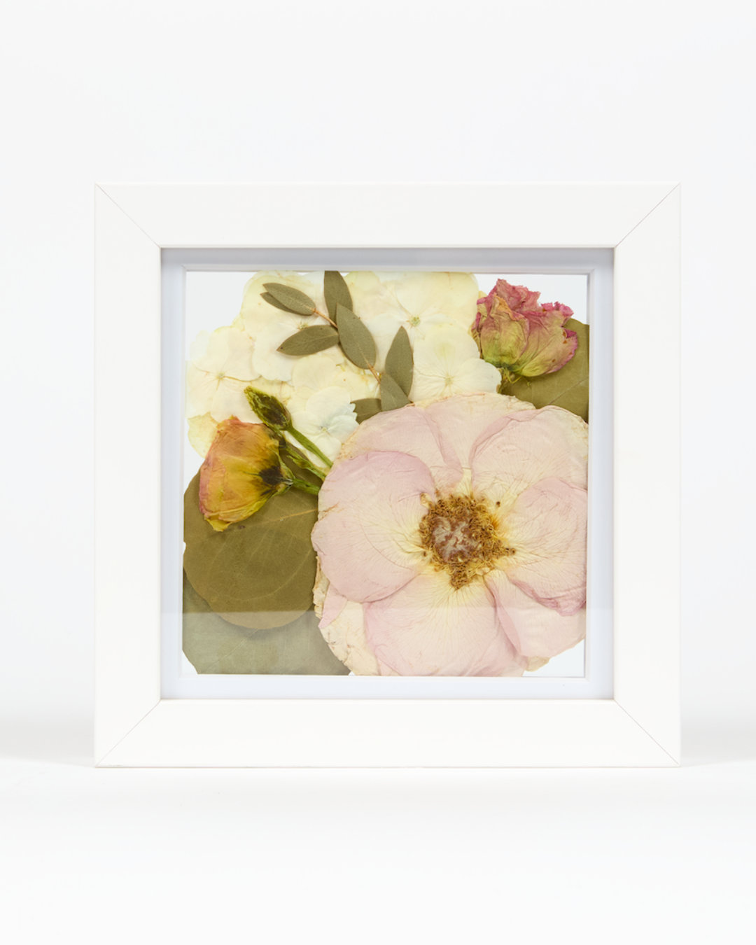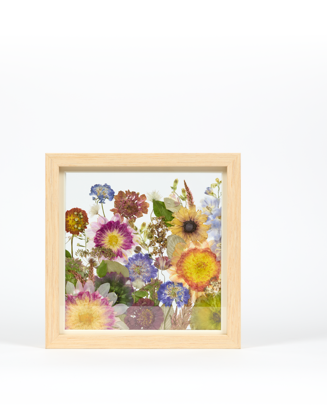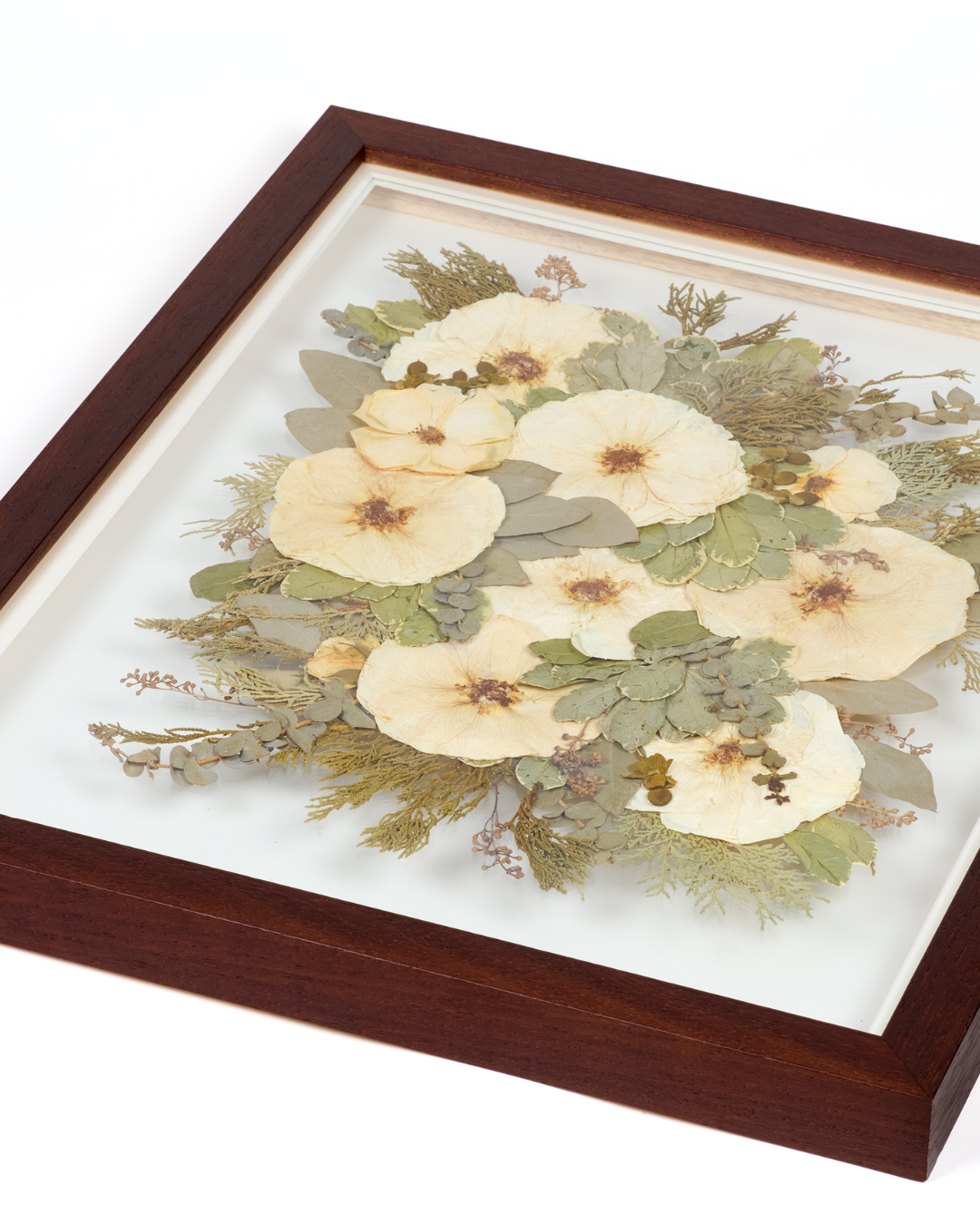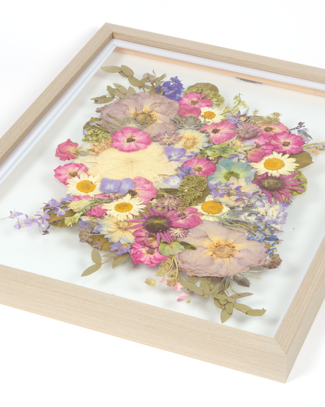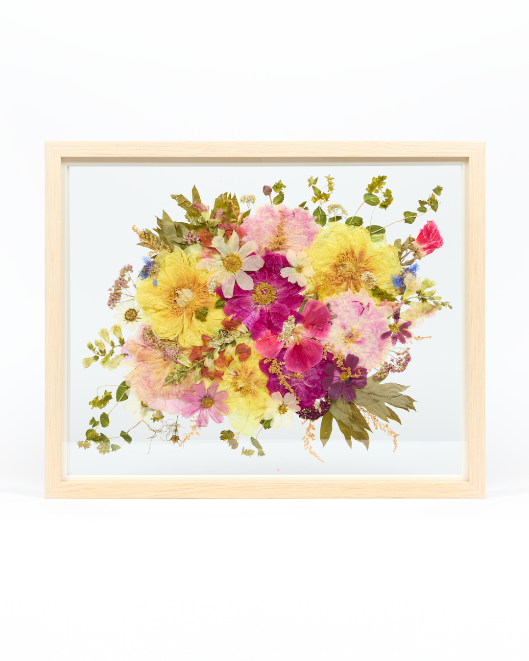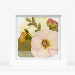 Taking an organic medium from a hydrated 3-dimensional shape to a dry 1-dimensional layer will result in change. From shape, to texture, and color- each bouquet presses differently. Some of the biggest changes you will notice are in the colors of the blooms themselves.