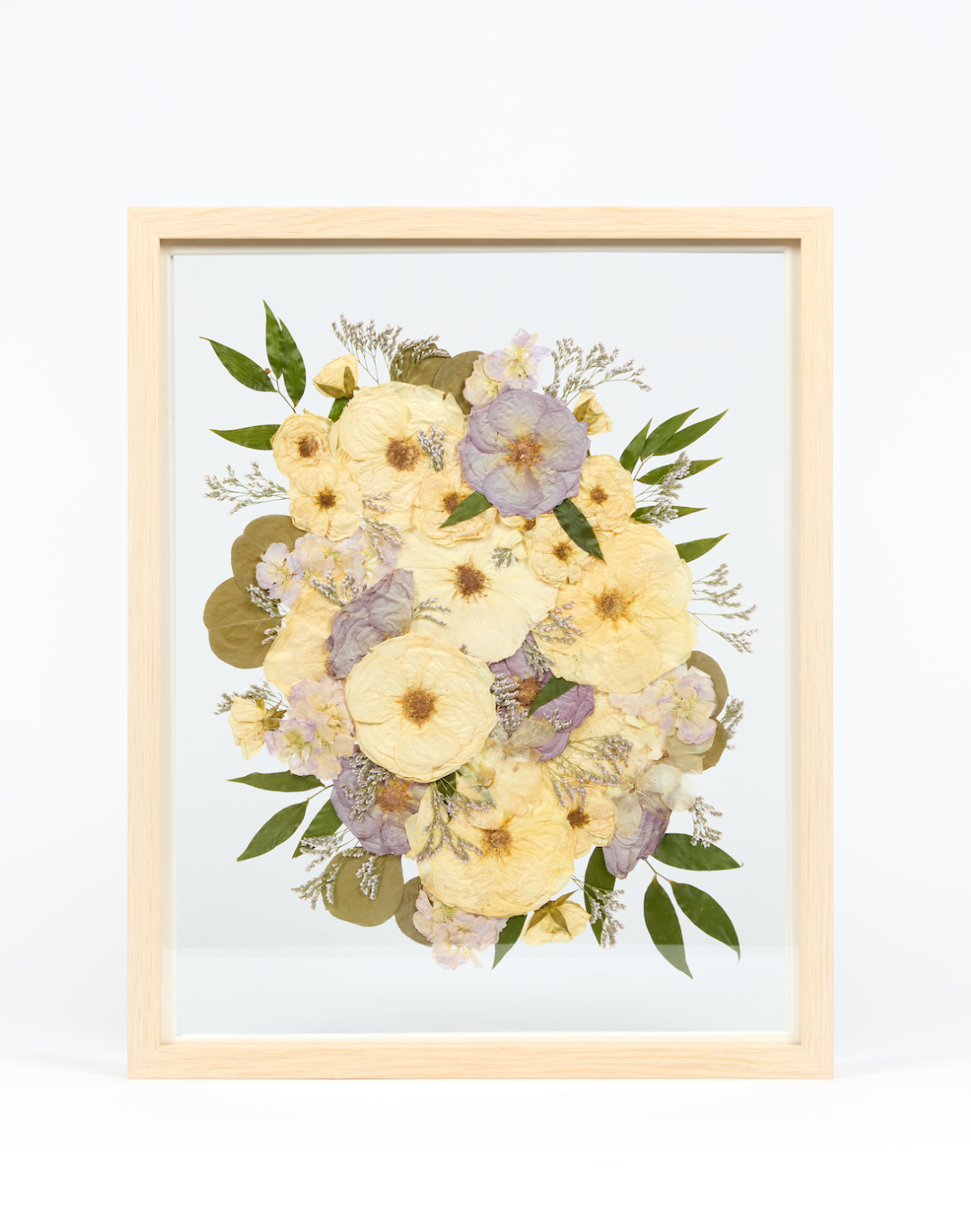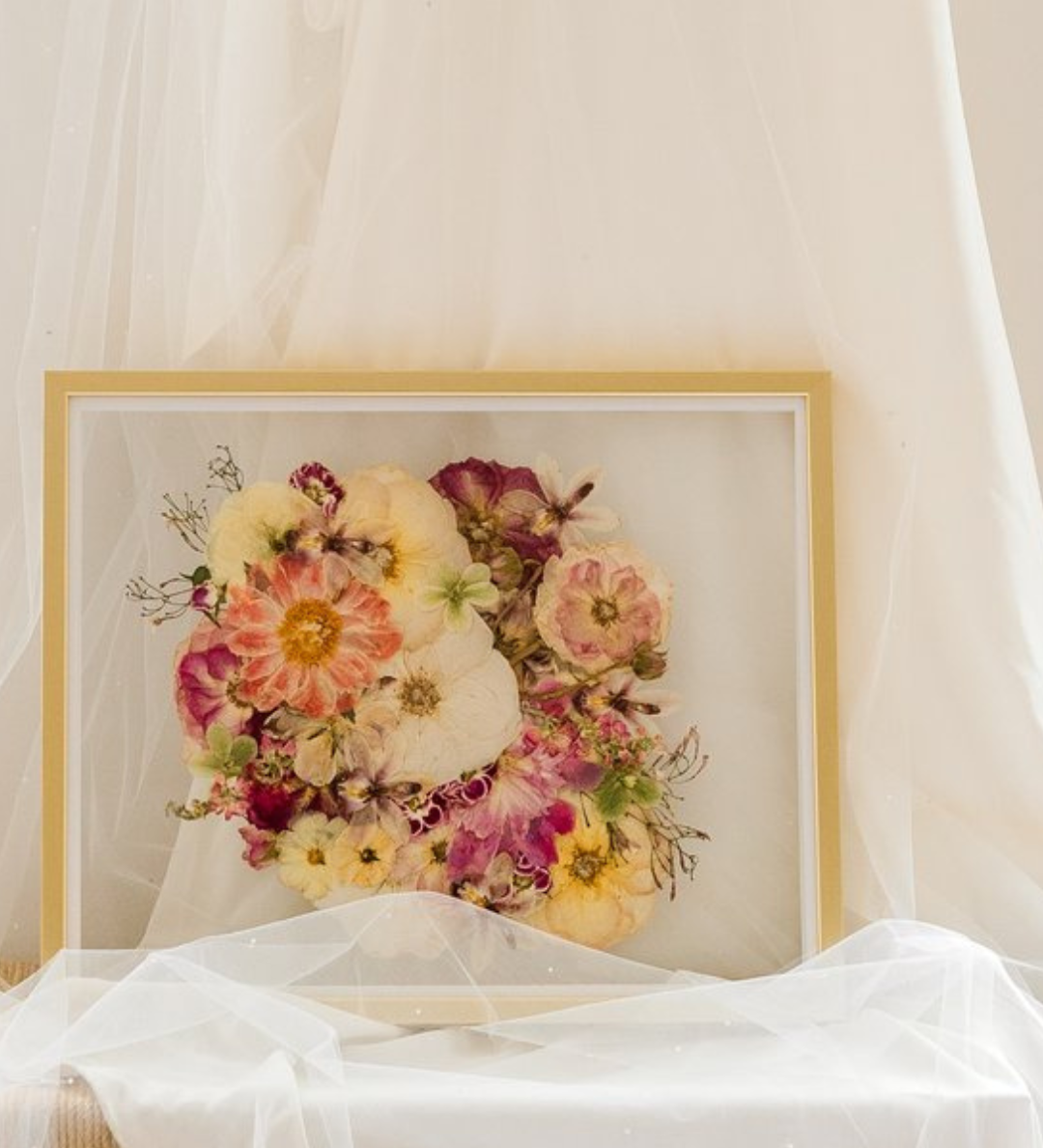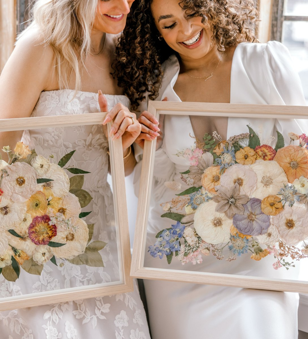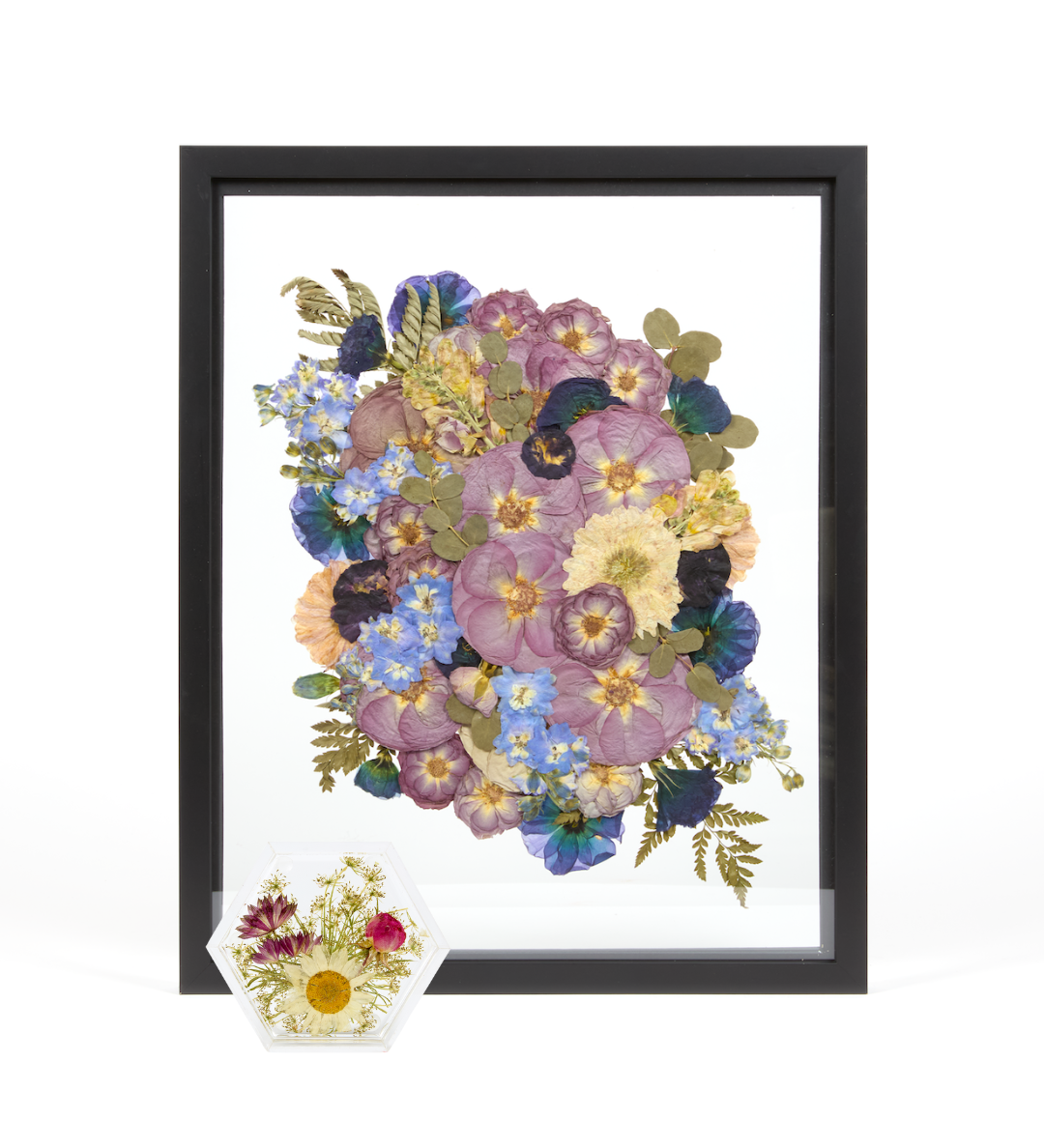 Taking an organic medium from a hydrated 3-dimensional shape to a dry 1-dimensional layer will result in change. From shape, to texture, and color- each bouquet presses differently. Some of the biggest changes you will notice are in the colors of the blooms themselves.