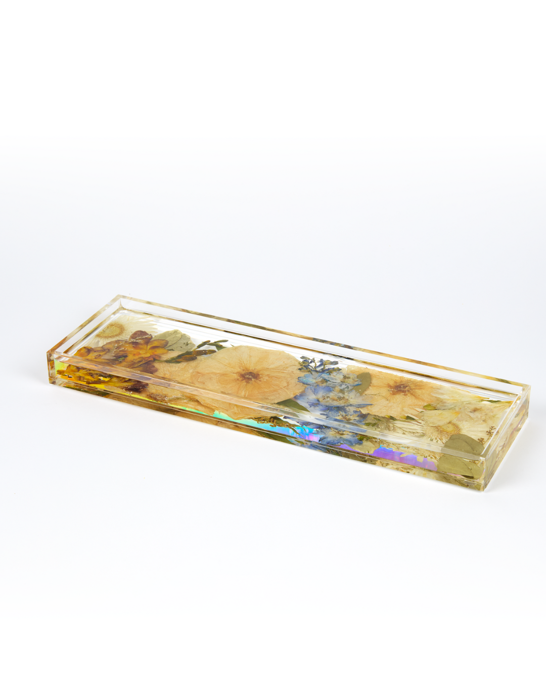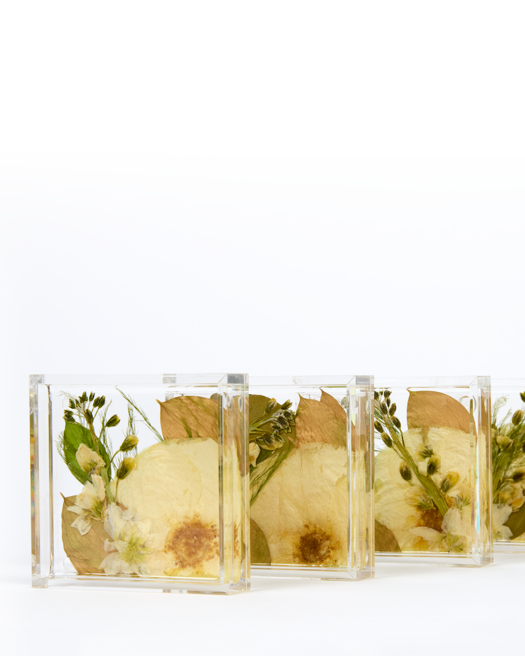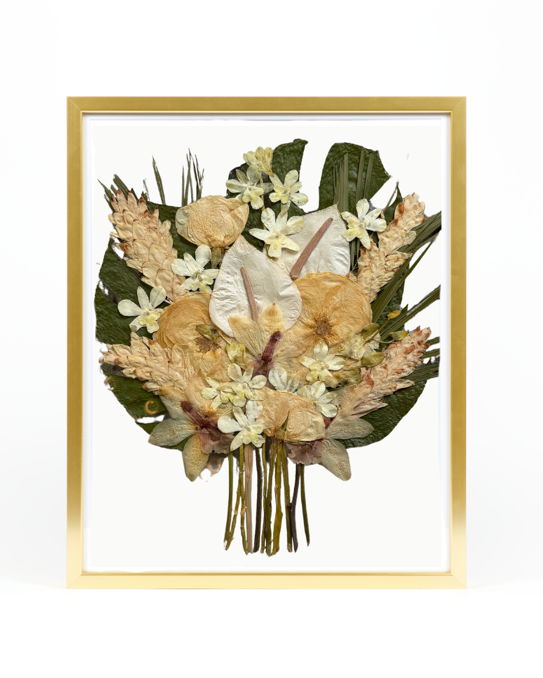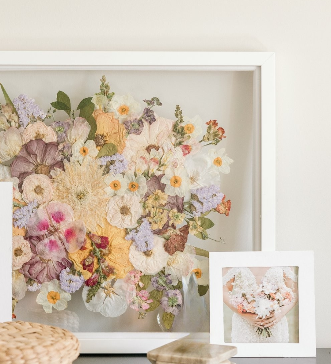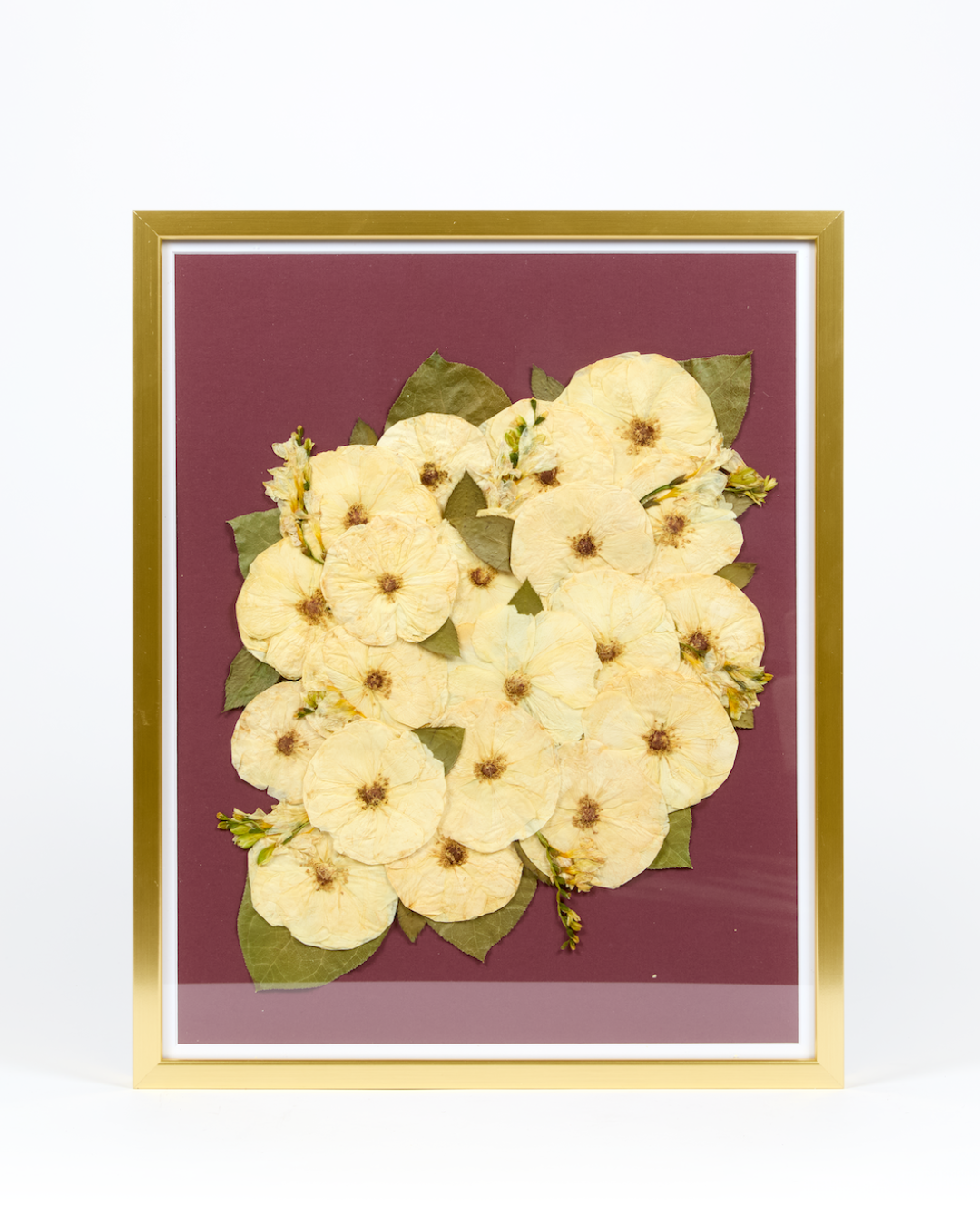 Taking an organic medium from a hydrated 3-dimensional shape to a dry 1-dimensional layer will result in change. From shape, to texture, and color- each bouquet presses differently. Some of the biggest changes you will notice are in the colors of the blooms themselves.